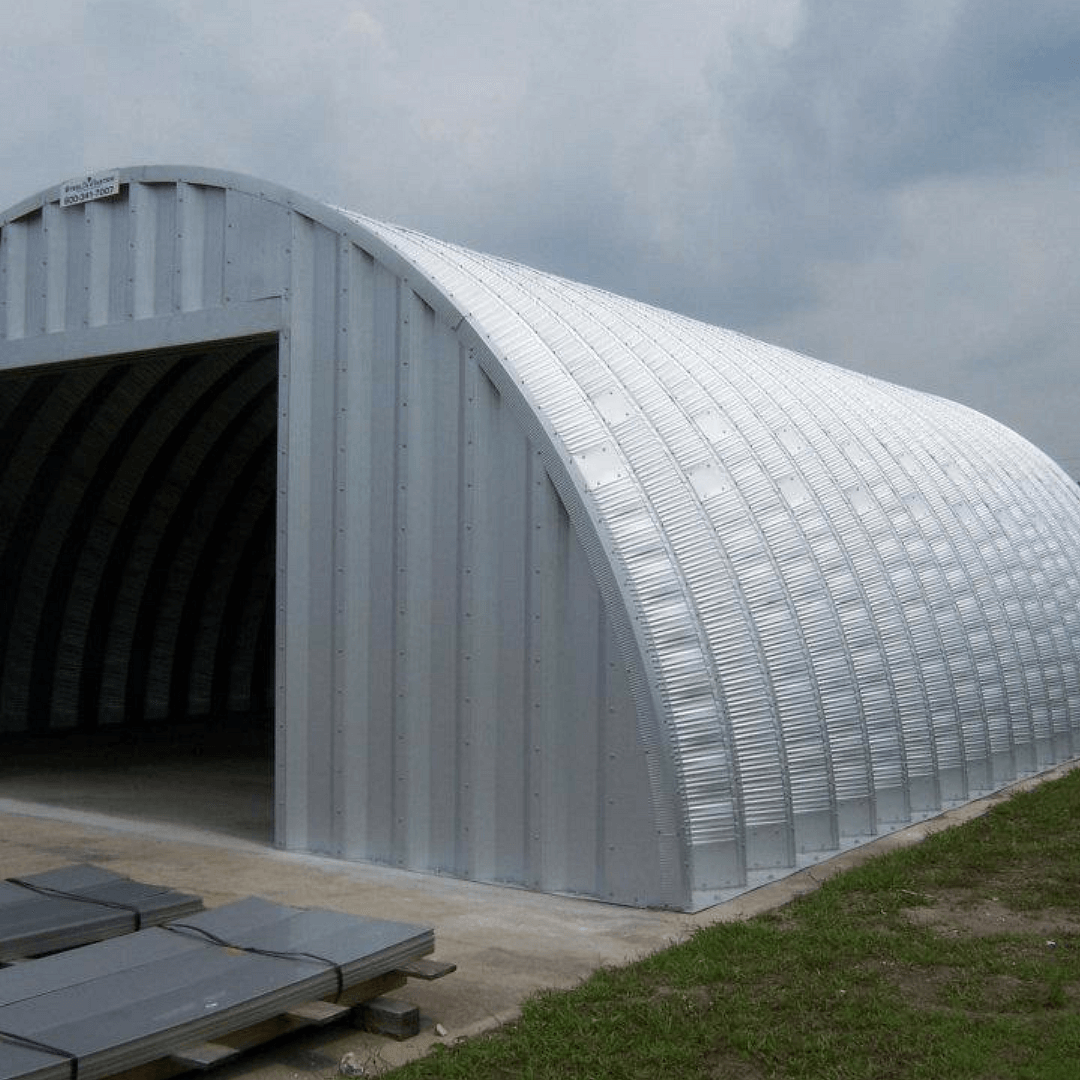 Это арочный ангар, который собирается отдельными арочными секциями на специальных болтах, обеспечивающих 100% герметичности. Отдельные элементы арочной секции изготавливаются на заводе из листовой оцинкованной стали марки 350 по ГОСТ 52246-2004 с цинковым покрытием 1-го класса.Толщина применяемой стали 0.8-1.5мм, в зависимости от пролета ангара и снеговой нагрузки.
